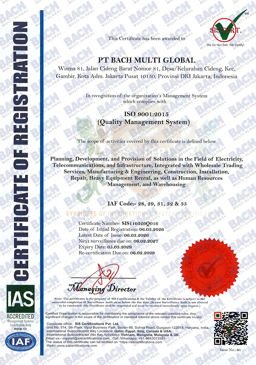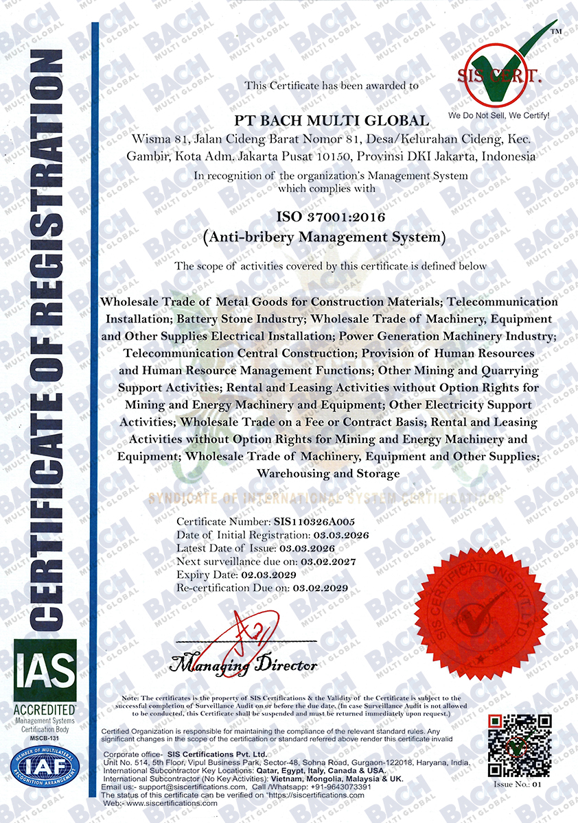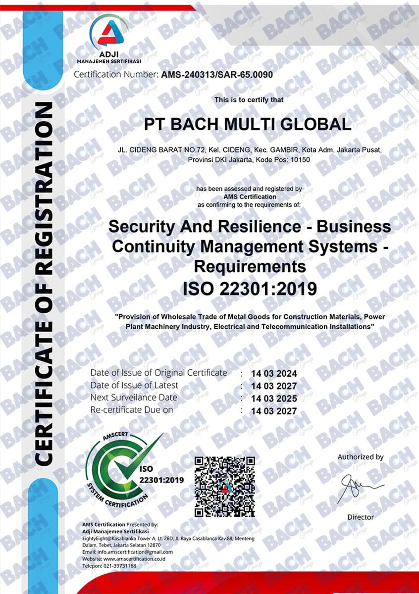 Certifications & AwardsProof of Our Quality Standards and Professionalism Certification Awards Certification Awards Certification PT Bach Multi Global Tbk’s commitment to quality standards, safety, and regulatory compliance at national and international levels.